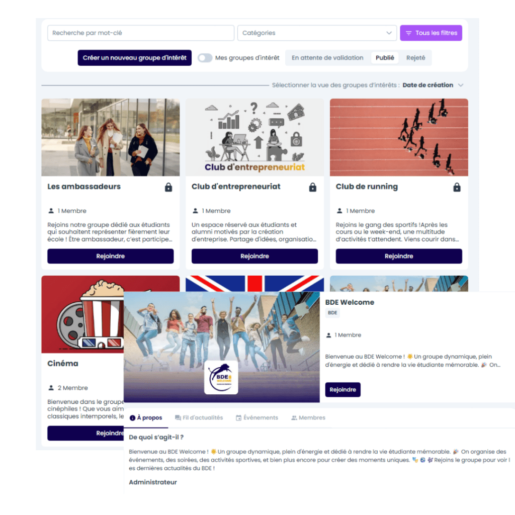 Elle offre à vos alumni, étudiants et partenaires des espaces dédiés pour échanger, partager et s’impliquer activement dans la vie de la communauté.