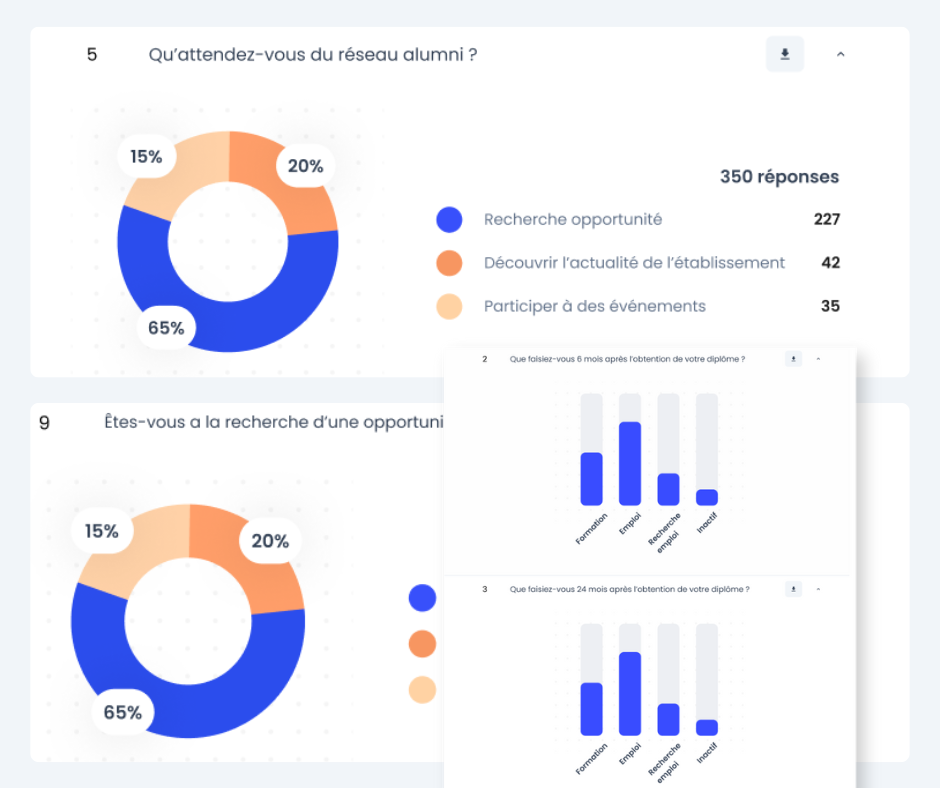 Les résultats des enquêtes alimentent votre approche smart data et vous offrent une vision précise des situations professionnelles, des trajectoires et des évolutions de vos diplômés.